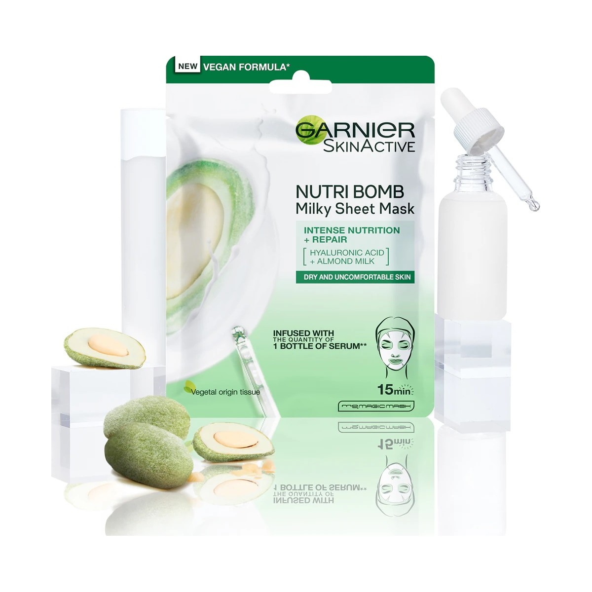 Verwöhne dich mit der ersten Tuchmaske von Garnier, die in ein Serum-Milch getränkt ist – für eine intensive Pflege und Reparatur trockener Haut in nur 15 Minuten.