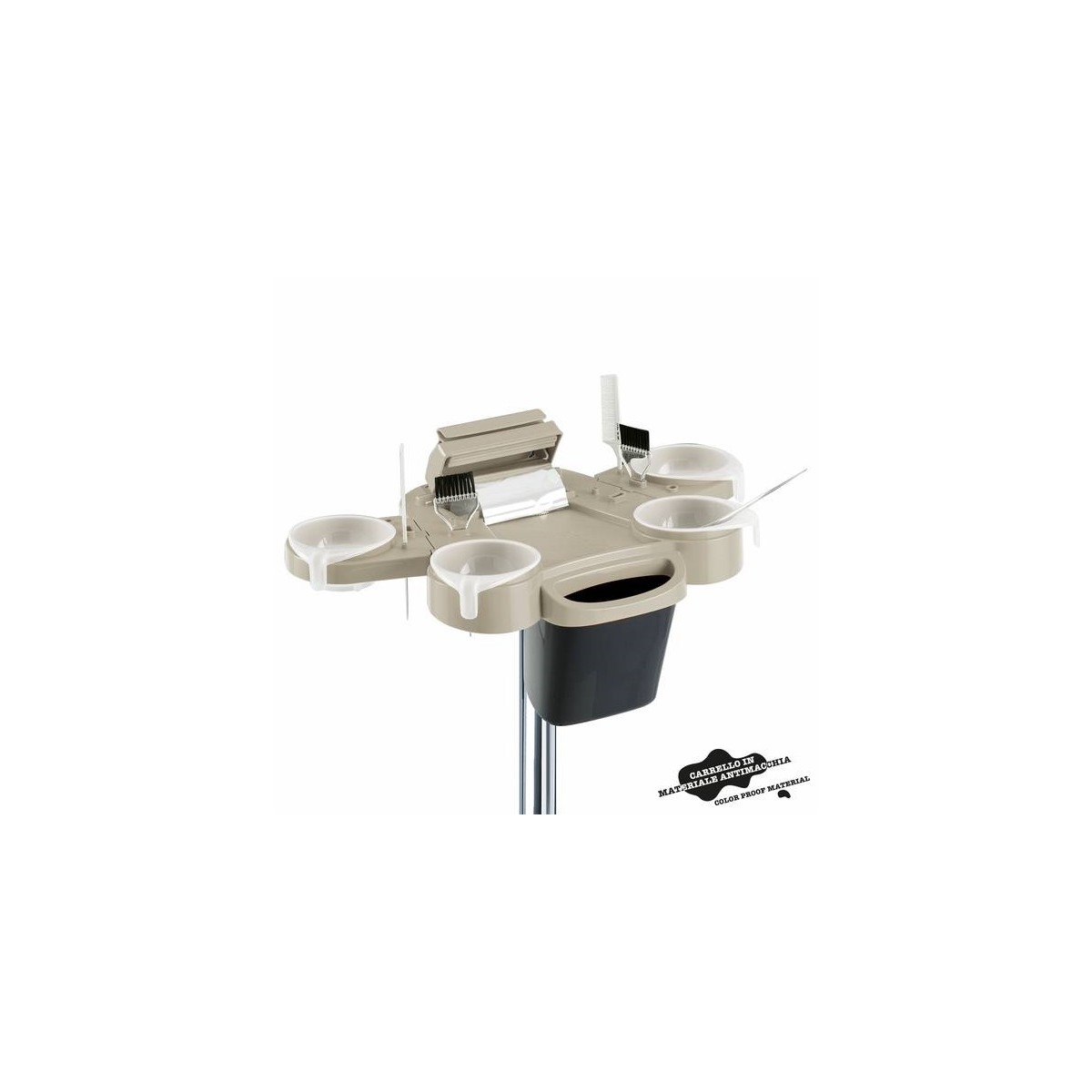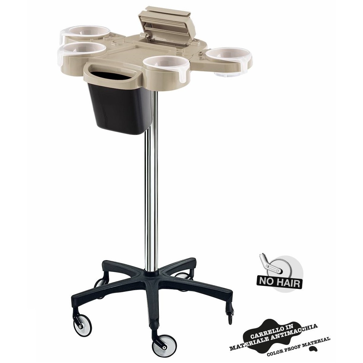 Carrello tecnico parrucchiere con quattro ciotole asportabili, sedi per pettini, spazzole e taglia-piega stagnola incorporato. Con le esclusive ruote NO-HAIR di Ceriotti che che essendo più alte e sottili delle ruote “tradizionali” riducono il contatto con il pavimento, raccogliendo meno capelli e rimanendo sempre pulite ed efficienti.