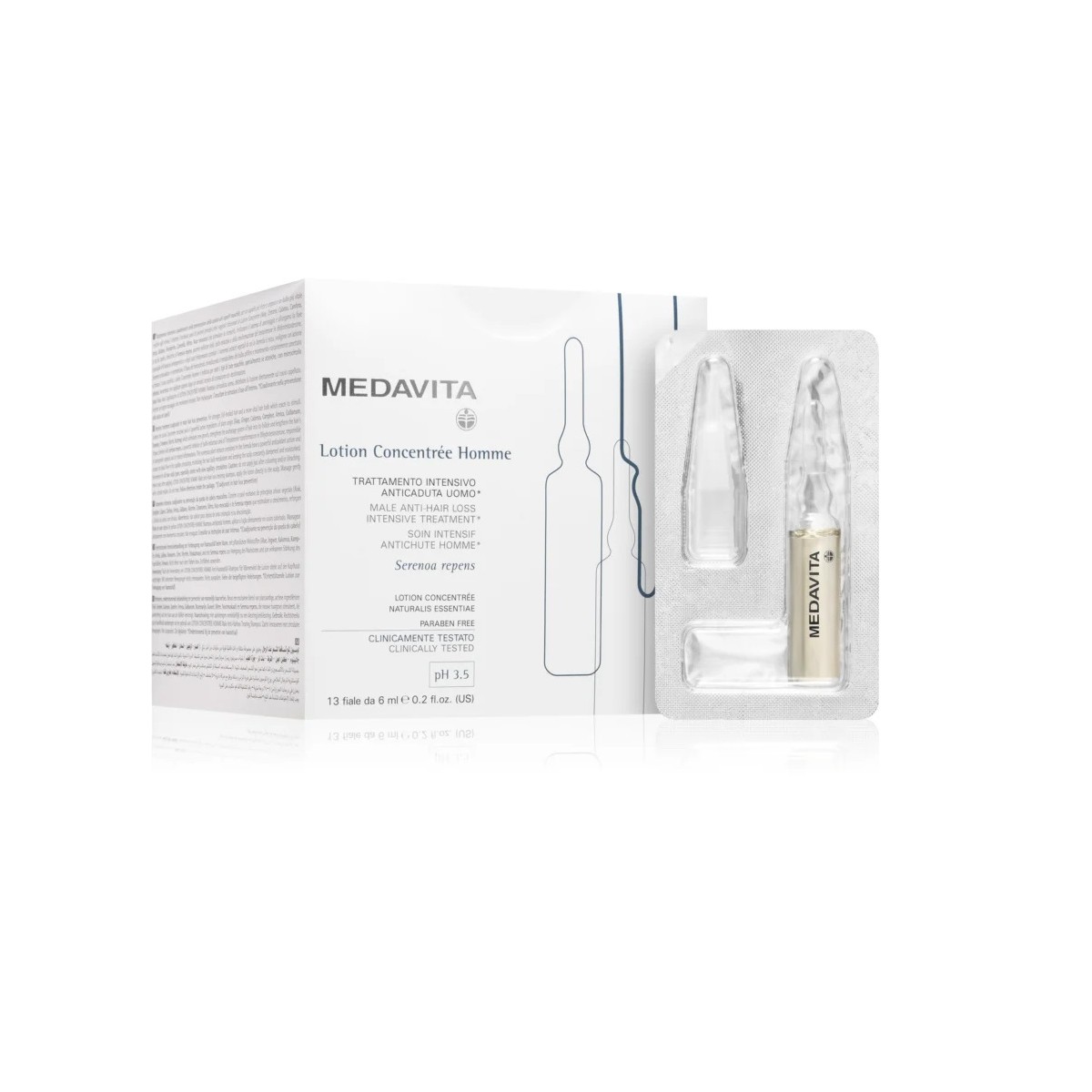 Medavita Lotion Concentree Homme Trattamento Intensivo Anticaduta Uomo 13 x 6 ml è un trattamento intensivo coadiuvante nella prevenzione della caduta dei capelli maschili. Questo trattamento è particolarmente indicato in caso di cuti atoniche e con microcircolo rallentato, come azione preventiva rispetto alla caduta dei capelli e come azione trattante nel caso la caduta sia già in essere.